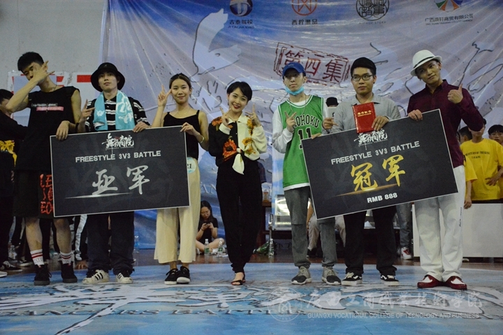 ? ? ? ? 最后經(jīng)過激烈的決戰(zhàn),“飛龍在天”戰(zhàn)隊冠軍贏得了freestyle3v3賽項的冠軍,“西城老男孩”拿下了Breaking賽項的冠軍,來自南寧職業(yè)技術(shù)學院的阿威贏得了seven to somke單人車輪戰(zhàn)的冠軍。賽后,來來老師和貓仔老師表演個人solo,在觀眾們熱烈的歡叫聲中,本次“舞戰(zhàn)商院”街舞大賽圓滿結(jié)束。