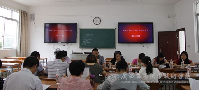 會(huì)議結(jié)束后,參會(huì)代表進(jìn)行了分組討論,由蔣百平主任、付光部長、林芳主任、劉萬英主任、林雯主任召集五個(gè)討論小組分別在教學(xué)樓2204、2205、2223、2224、2225教室討論關(guān)于我院章程的建設(shè)(征求意見稿)。分組討論中,代表們就《廣西工商職業(yè)技術(shù)學(xué)院章程》發(fā)表了自己的意見和看法。各方積極配合,全體共同努力探討結(jié)果。至下午17點(diǎn)10分,我院三屆三次教代會(huì)臨時(shí)會(huì)議圓滿結(jié)束。
