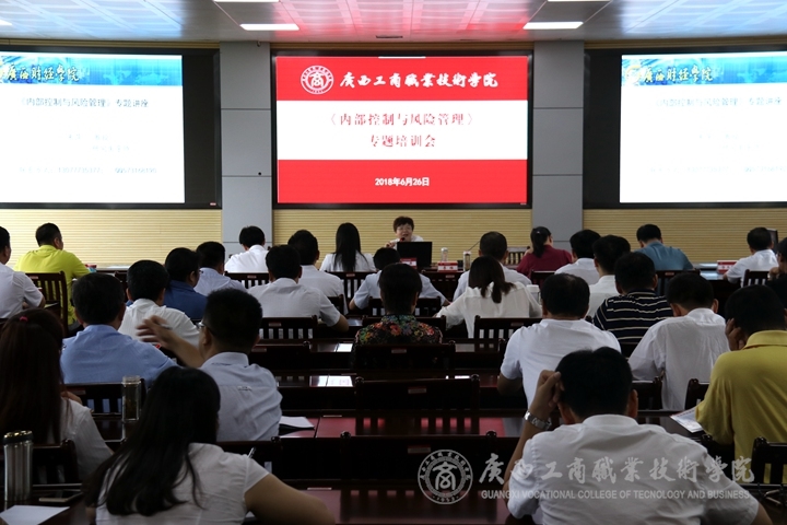 ? ? ? ? 為了進(jìn)一步提高廣西工商職業(yè)技術(shù)學(xué)院內(nèi)部管理水平,規(guī)范內(nèi)部控制,加強(qiáng)廉政風(fēng)險(xiǎn)防控,學(xué)院于6月26日上午在鵬飛校區(qū)會(huì)議室開(kāi)展內(nèi)部控制專(zhuān)題培訓(xùn),此次培訓(xùn)會(huì)邀請(qǐng)廣西財(cái)經(jīng)學(xué)院朱萍教授到我院作《內(nèi)部控制與風(fēng)險(xiǎn)管理》專(zhuān)題講座。學(xué)院副院長(zhǎng)李維、學(xué)院中層管理干部、學(xué)院內(nèi)部控制工作領(lǐng)導(dǎo)小組成員及辦公室成員、學(xué)院后勤管理處、武鳴新校區(qū)辦公室、資產(chǎn)管理中心、監(jiān)察室、審計(jì)室、財(cái)務(wù)處等部門(mén)全體人員參加了本次內(nèi)部控制培訓(xùn)會(huì)。