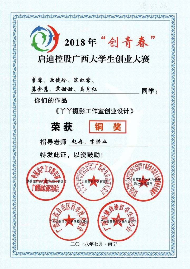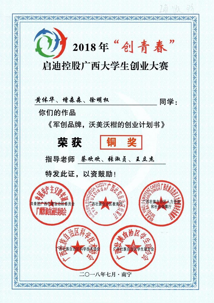 近日,共青團廣西區(qū)委、自治區(qū)教育廳、自治區(qū)人力資源和社會保障廳、自治區(qū)科協(xié)、廣西學聯(lián)共同公布了2018年“創(chuàng)青春”啟迪控股廣西大學生創(chuàng)業(yè)大賽結果通報,我院蔡振江、李霖、黃體華等多名學子在2018年“創(chuàng)青春”廣西大學生創(chuàng)業(yè)大賽中獲獎。獲獎作品分別為:《從田間到餐桌的綠色放心農(nóng)產(chǎn)品——廣西大新縣鄉(xiāng)源生態(tài)農(nóng)業(yè)合作社》(指導教師:劉結玲、張煌強、莫春華)、《丫丫攝影工作室創(chuàng)業(yè)設計》(指導教師:趙冉、李洪業(yè))、《軍創(chuàng)品牌,沃美沃柑的創(chuàng)業(yè)計劃書》(指導教師:蔡歡歡、張淑貞、王立杰)。以上作品在大賽中都獲得了銅獎!