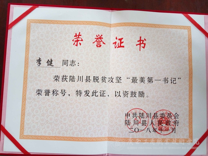 近日,在2018年度陸川縣委、縣人民政府的評選中,我院派出教師李健榮獲陸川縣脫貧攻堅“最美第一書記”榮譽稱號。