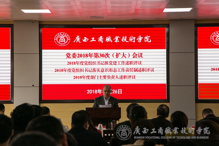 2018年12月26日上午,學(xué)院黨委于校本部2119會(huì)議室召開(kāi)2018年第三十次(擴(kuò)大)會(huì)議,專題聽(tīng)取各黨總支、各直屬黨支部書(shū)記和各部門主要負(fù)責(zé)人作2018年度述職報(bào)告。學(xué)院黨委書(shū)記覃武云、黨委副書(shū)記、紀(jì)委書(shū)記蒙啟成、副院長(zhǎng)、黨委委員李仕欽、副院長(zhǎng)、黨委委員李維、副院長(zhǎng)、黨委委員陳寧春、黨委委員蔣百平、黨委委員林雯出席會(huì)議,本次會(huì)議由覃武云主持。學(xué)院中層管理人員、教代會(huì)代表、各黨總支、直屬黨支部委員、組織員、黨委部門職工代表列席。