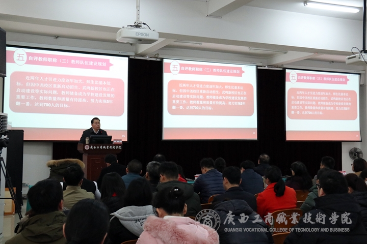 2019年1月11日,學院于鵬飛校區(qū)2145報告廳召開2018—2019學年第一學期期末大會,學院黨委書記覃武云、院長陳杰、黨委副書記、紀委書記蒙啟成、副院長李仕欽、副院長陳寧春出席,各部門、各單位負責人、全體教職工參加了會議。本次會議由覃武云書記主持。