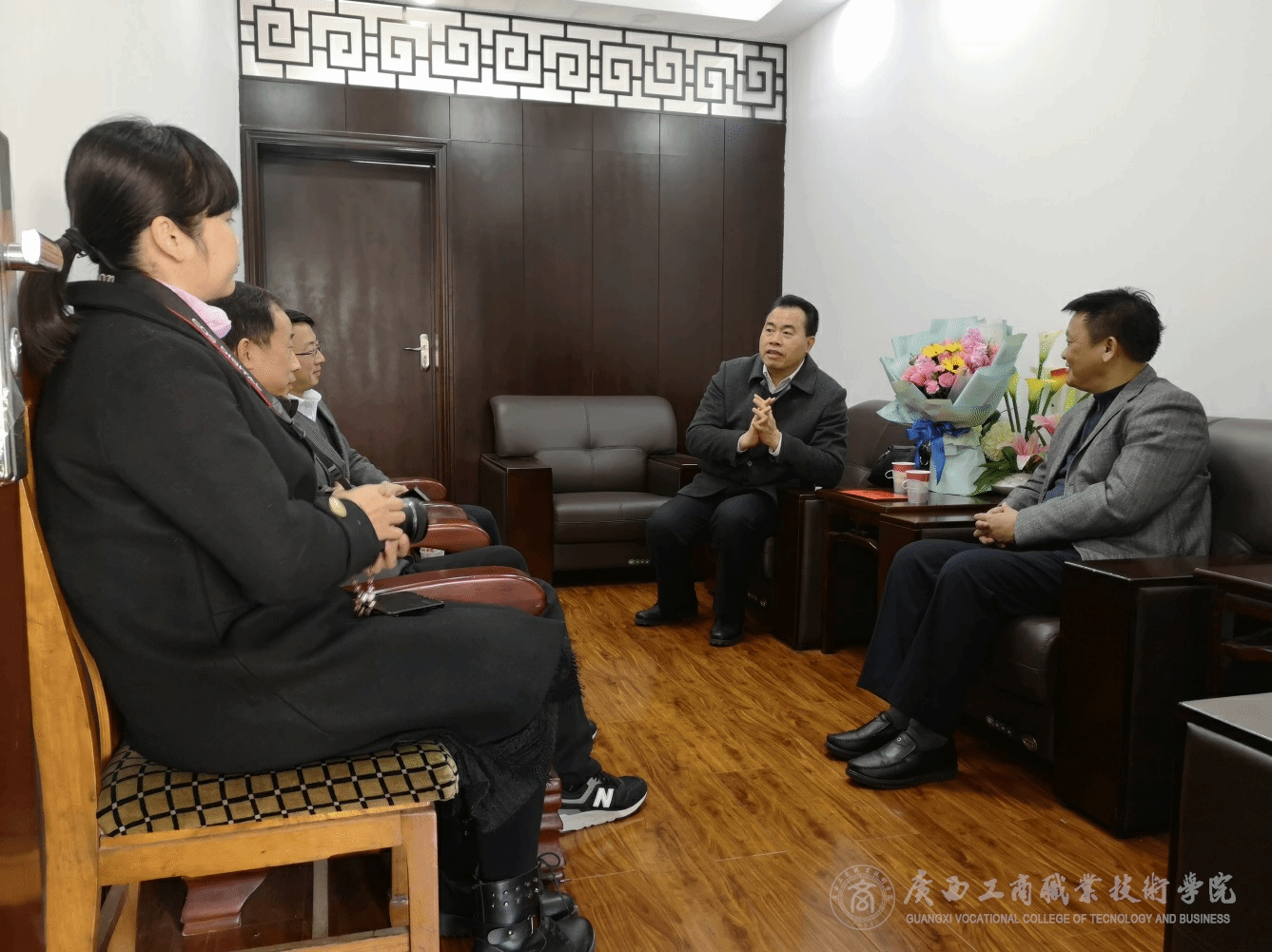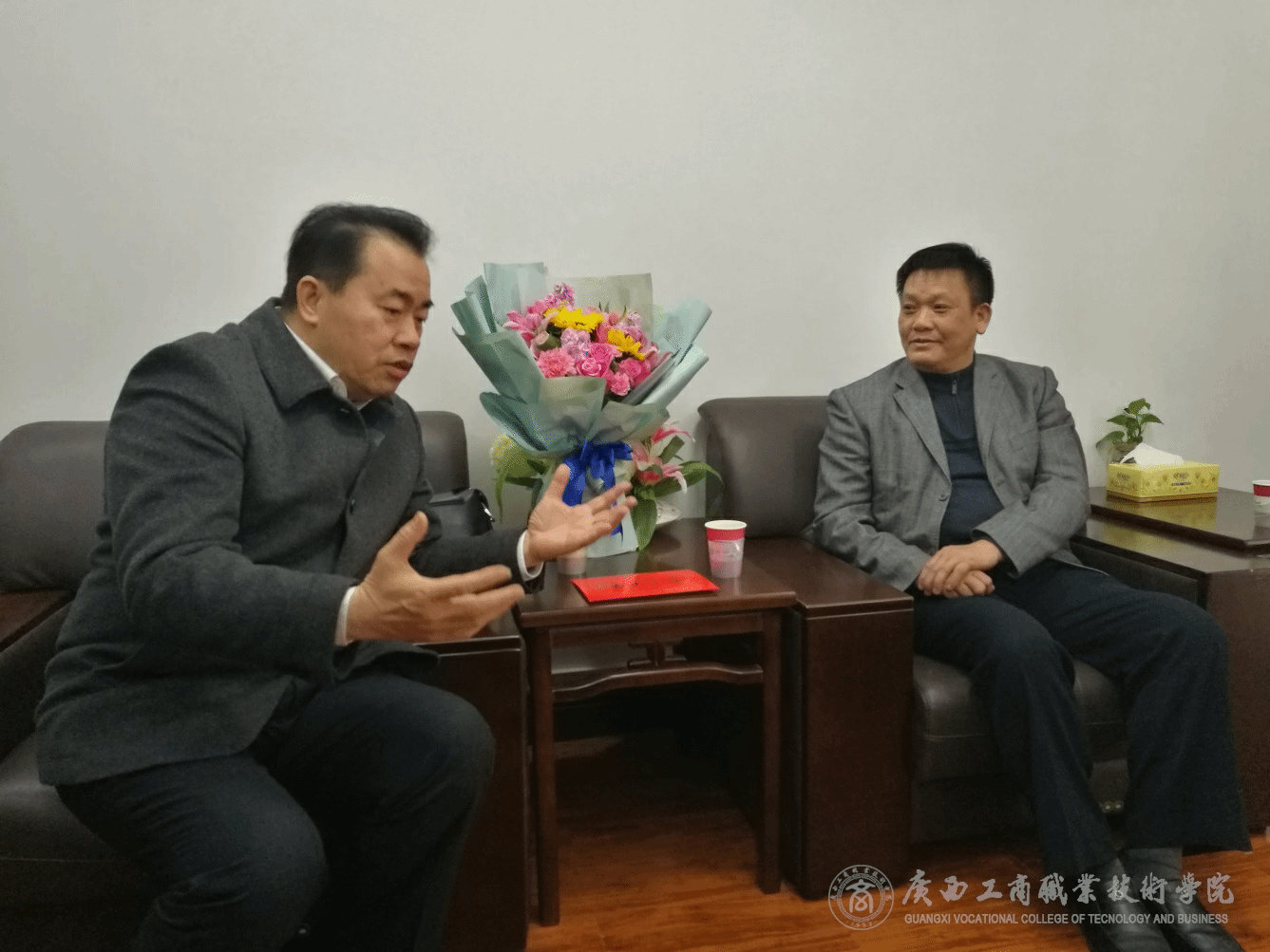 ? ? 2019年1月18日,西鄉(xiāng)塘區(qū)委常委、政法委書記藍(lán)日軍同志率隊(duì)到我院對(duì)學(xué)院二級(jí)教授陳杰院長進(jìn)行走訪慰問,陳杰院長在學(xué)院接待室接待了藍(lán)日軍書記一行并開展座談交流。藍(lán)日軍書記代表西鄉(xiāng)塘區(qū)黨委對(duì)陳杰院長致以誠摯問候,表達(dá)了深切的關(guān)愛,向陳杰院長贈(zèng)送了鮮花和慰問金。藍(lán)日軍書記表示,西鄉(xiāng)塘區(qū)黨委歷來重視各類專家人才,真切希望陳杰院長與城區(qū)之間繼續(xù)保持緊密的聯(lián)系。座談結(jié)束后,陳杰院長帶領(lǐng)藍(lán)日軍書記一行參觀了學(xué)院校園,并向介紹了學(xué)院的新風(fēng)貌、新氣象。