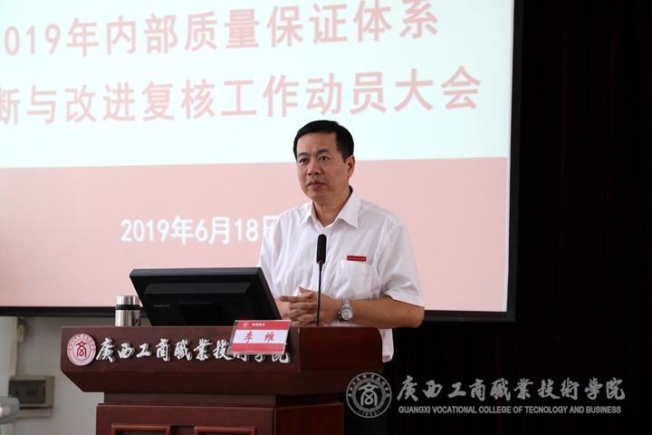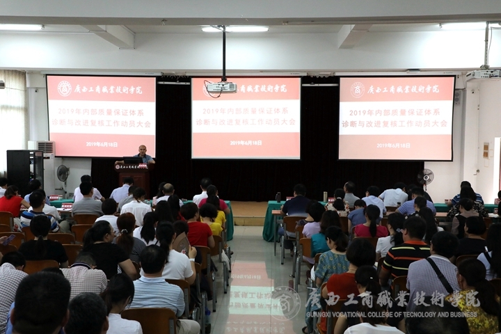 ? ? ? ? 為順利迎接學院內(nèi)部質(zhì)量保證體系診斷與改進復核工作,2019年6月18日下午,我院于鵬飛校區(qū)教學樓報告廳召開2019年內(nèi)部質(zhì)量體系診斷與改進復核工作動員大會,學院黨委書記覃武云、院長李維、黨委副書記、紀委書記蒙啟成出席了本次會議,全體中層干部、各系部全體教師、教務(wù)科研處、黨委教師工作部、黨委學生工作部、評估督導室、現(xiàn)代教育技術(shù)中心相關(guān)人員參加了本次會議。本次大會由黨委書記覃武云主持,院長李維在會上做動員講話。?