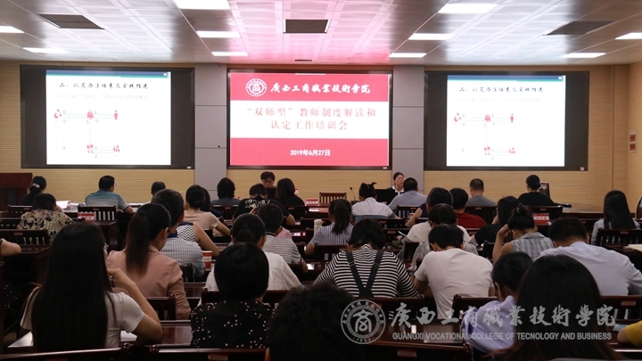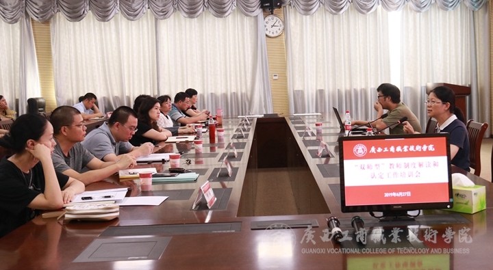 ? ? ? ? 為了貫徹中央及自治區(qū)關于高職院?!半p師型”教師培養(yǎng)的相關文件精神,建設一支教學能力和專業(yè)實踐能力兼?zhèn)涞摹半p師型”教師隊伍,結合學院“雙師型”教師申報認定工作,2019年6月27日下午,我院于鵬飛校區(qū)視頻會議室召開2019年廣西高等職業(yè)院?!半p師型”教師認定制度解讀和認定工作培訓會。?