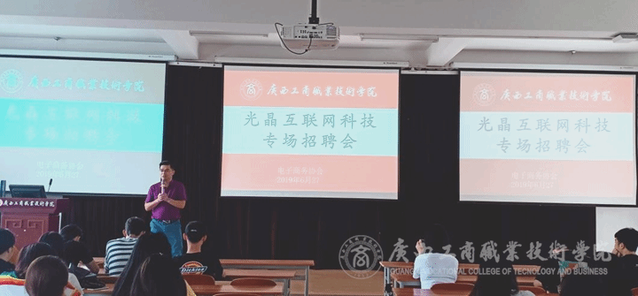 ? ? ? ? 2019年6月27日下午,學(xué)院電子商務(wù)協(xié)會在鵬飛校區(qū)教室舉辦了2017級頂崗實習(xí)專場推介會。電子商務(wù)協(xié)會指導(dǎo)老師蔡歡歡首先致辭并介紹了招聘企業(yè)負責(zé)人。緊接著由廣西光晶網(wǎng)絡(luò)科技有限公司申博文總經(jīng)理對公司概況、經(jīng)營業(yè)務(wù)、行業(yè)前景、招聘職位等進行了詳細介紹。宣講之后有一百多位同學(xué)集中學(xué)院創(chuàng)客空間參加面試,并最終獲得了入職該公司實習(xí)的機會。