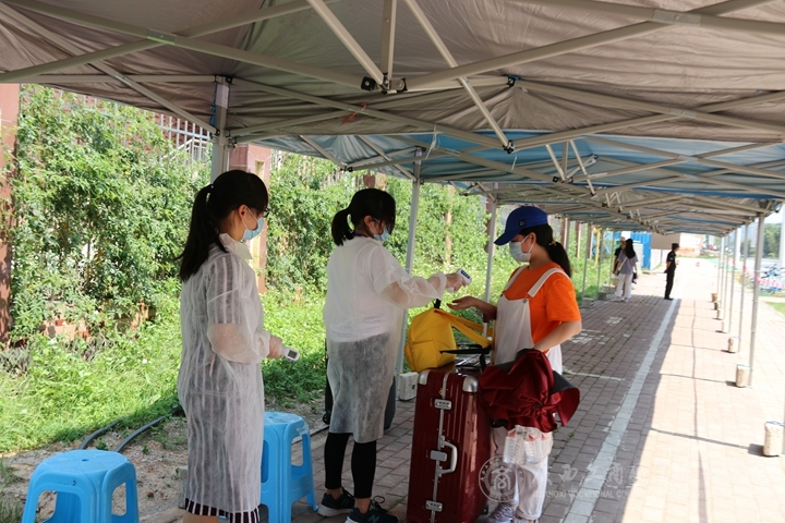 學(xué)子們陸續(xù)前來報到了,只見他們帶著行李,戴著口罩,踏進(jìn)安置在校門口的帳篷中,根據(jù)地上貼好的指示標(biāo)識,按1.5米間隔排隊等待著。在秩序引導(dǎo)員的指引下,先由工作人員對他們測量體溫,隨后行李消殺員對其行李進(jìn)行消殺,同學(xué)們再來到“口罩換取點”,取掉原口罩,放進(jìn)“口罩專用丟棄箱”,用免洗消毒液給雙手消毒,自取一個學(xué)院配發(fā)的新口罩戴上,隨后有序排隊到“第一次測溫點”測溫。