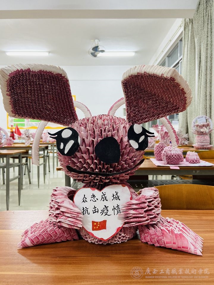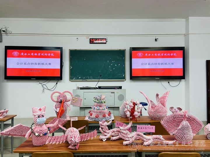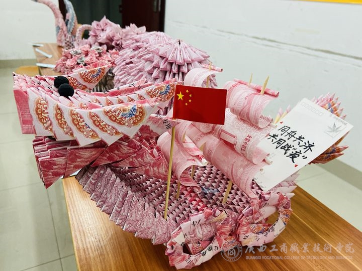 參賽作品主要使用的材料是廢棄的點鈔練功券,由各個參賽隊伍結(jié)合自身的創(chuàng)意,圍繞主題折疊出不同造型的作品,歷時一星期精心準備。本次比賽旨在鼓勵全系學生充分利用課余時間,培養(yǎng)技能,提高職業(yè)技能水平和動手能力,增強創(chuàng)新意識。