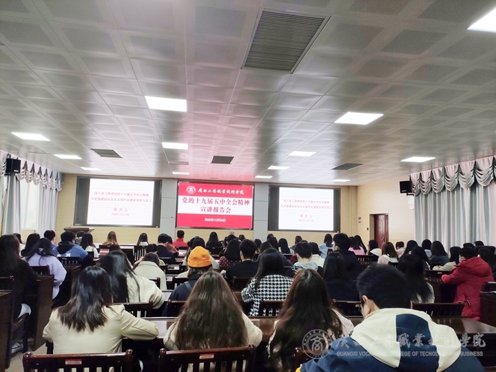 12月26日上午,學院黨委書記覃武云在鵬飛校區(qū)2119會議室為我院2018級預(yù)備黨員和積極分子學生宣講黨的十九屆五中全會精神。2018級預(yù)備黨員、積極分子學生和教師代表認真聽取了此次宣講。