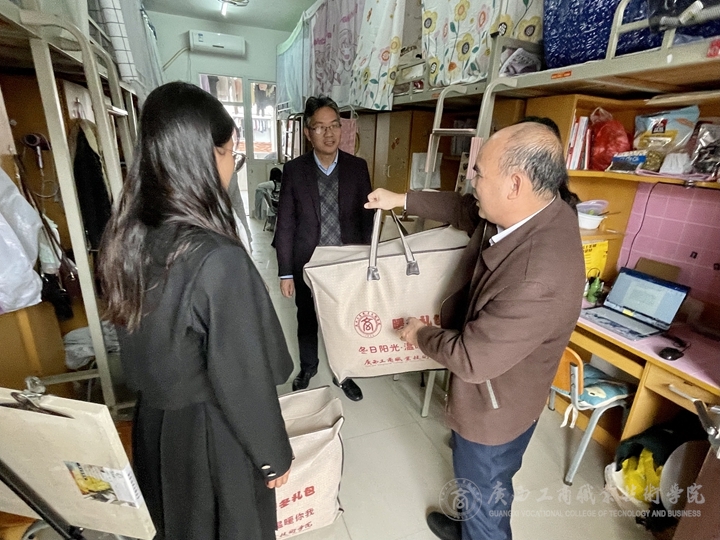 12月29日上午,學(xué)院黨委書記覃武云,學(xué)院黨委學(xué)生工作部林雯部長,信息與設(shè)計學(xué)院黨總支書記黃旭艷與信息與設(shè)計學(xué)院輔導(dǎo)員一同深入學(xué)生宿舍送溫暖,為建檔立卡學(xué)生送去過冬棉被等慰問物品。覃武云書記親切與學(xué)生交談,了解學(xué)生的家庭情況、在校期間的學(xué)習(xí)、生活等情況。交談中,學(xué)生對學(xué)校領(lǐng)導(dǎo)老師給予的關(guān)心和幫助表示真切的感謝,天氣寒冷,但她們感到心里無比的溫暖。