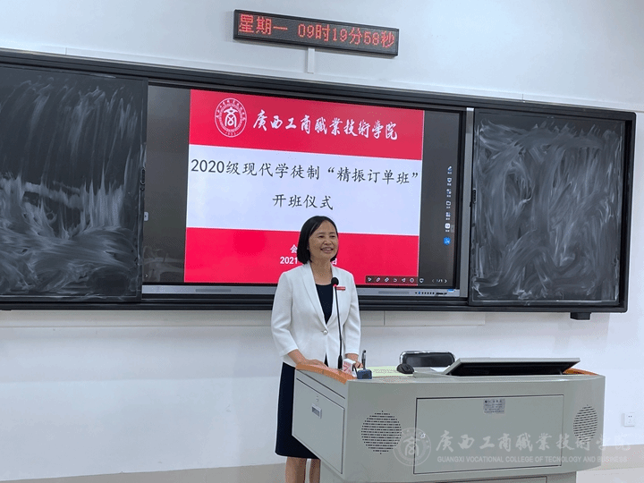 儀式開始,首先由會計學(xué)院院長粟衛(wèi)紅向大家介紹了現(xiàn)代學(xué)徒制訂單班的設(shè)立初衷和人才培養(yǎng)目標,并向企業(yè)導(dǎo)師團隊和學(xué)生提出希望和要求。希望導(dǎo)師團隊要以立德樹人為根本,把自己豐富的工作經(jīng)驗、愛崗敬業(yè)的奉獻精神通過言傳身教的方式傳遞給徒弟學(xué)員;學(xué)員要虛心向師傅學(xué)習(xí),勤奮學(xué)習(xí)、刻苦鉆研,秉承工匠精神,不斷豐富自我,完善自我。隨后,精振公司總經(jīng)理鐘思敏向大家介紹了參加本次開班式的各位企業(yè)導(dǎo)師?、公司文化、培育人才理念,并與同學(xué)們分享了職業(yè)生涯規(guī)劃和專業(yè)前景。