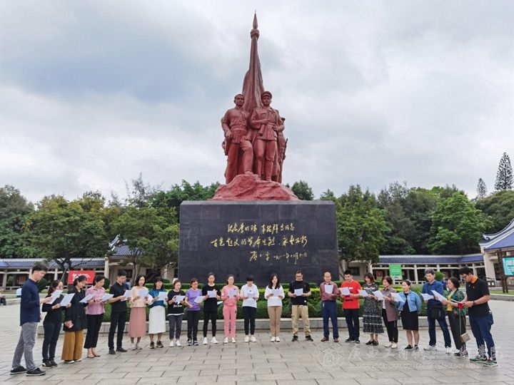 在李明瑞、韋拔群等革命烈士紀(jì)念碑前,全體黨員同志集體誦讀詩(shī)歌《紅船的方向》,瞻仰革命烈士群雕,緬懷革命先輩為中國(guó)革命事業(yè)英勇獻(xiàn)身的英雄事跡。