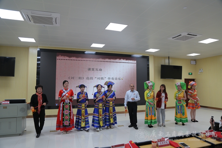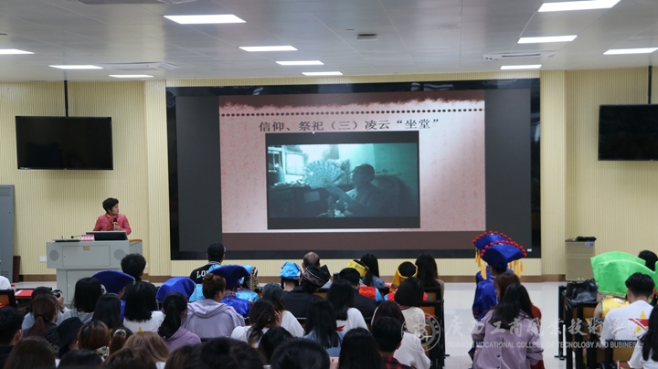 講座在師生合唱的《唱支山歌給黨聽(tīng)》中拉開(kāi)帷幕,徐教授從壯族的人口、分布、語(yǔ)言以及民族民歌的文化特征入手,通過(guò)在全區(qū)采風(fēng)拍到、錄到的歌圩、對(duì)歌的影音資料,與同學(xué)們以互動(dòng)的形式,共同感受了民歌的過(guò)去現(xiàn)在未來(lái),為在場(chǎng)師生講了一場(chǎng)生動(dòng)的民族文化講座。徐教授講課過(guò)程中隨口哼唱的民歌小調(diào),屢屢引得現(xiàn)場(chǎng)師生和聲合唱,引發(fā)了課堂的一個(gè)個(gè)小高潮。講座上,她以文化品牌“印象劉三姐”為例教育我院學(xué)生,要發(fā)揚(yáng)商院學(xué)科特色,利用好廣西“東盟橋頭堡”的區(qū)位優(yōu)勢(shì),經(jīng)營(yíng)好“原生態(tài)”的文化產(chǎn)業(yè)。同時(shí)要厚植愛(ài)國(guó)情懷,提升文化自覺(jué)、樹(shù)立文化自信、不斷提高文化軟實(shí)力,保障好文化安全和民族安全。活動(dòng)現(xiàn)場(chǎng),師生們還表演了極具民族特色的竹竿舞、拋繡球和民歌獨(dú)唱、對(duì)唱節(jié)目。