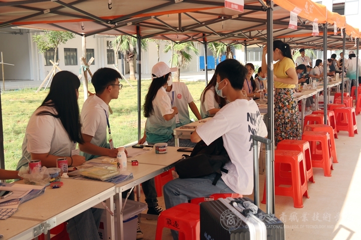 在校門口,新生根據(jù)報道流程,掃健康碼、消毒、測體溫后由校園志愿者接送到報到處。報到現(xiàn)場,各班班助有序地為新生做好報到登記、安排宿舍、飯卡發(fā)放等工作,耐心地為新生、家長答疑解惑。學(xué)生志愿者們?yōu)樾律_啟了“一站式迎新”服務(wù),從交驗材料、繳費(fèi)注冊,到存放行李、核驗新生身份等每一個流程和環(huán)節(jié)都有學(xué)生志愿者們的熱情引導(dǎo),悉心服務(wù)。后勤部在各宿舍、路口等地方設(shè)工作點(diǎn),保衛(wèi)師傅一手抓疫情防控、一手抓校園安保,同時進(jìn)行車流引導(dǎo)、協(xié)調(diào)校園交通,為迎新工作的有序進(jìn)行保駕護(hù)航。
