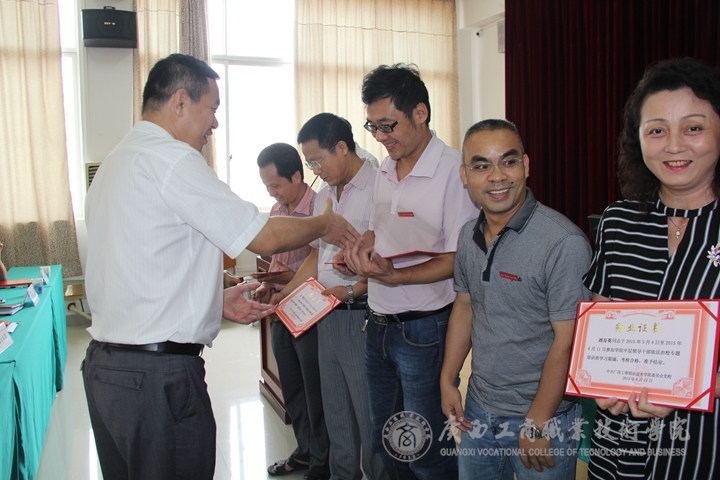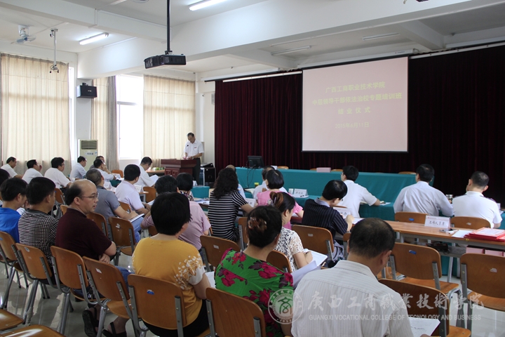 2015 年 6 月 11日下午,我院在校本部教學(xué)樓報(bào)告廳舉辦中層領(lǐng)導(dǎo)干部依法治校專題培訓(xùn)班結(jié)業(yè)儀式。學(xué)院領(lǐng)導(dǎo)覃武云、蒙啟成、李仕欽、李維出席,學(xué)院中層以上領(lǐng)導(dǎo)干部參加。儀式由蒙啟成副書記主持。