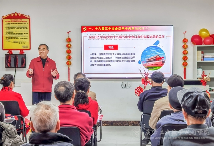 2022年1月6日上午,學(xué)院黨委副書記蒙啟成同志在中堯路校區(qū)“金秋家園”離退休黨員活動(dòng)室向離退休老同志宣講黨的十九屆六中全會(huì)精神。離退休老黨員、老干部、老職工代表近50人到場(chǎng)聆聽,同時(shí)在離退休老同志工作交流群轉(zhuǎn)播。