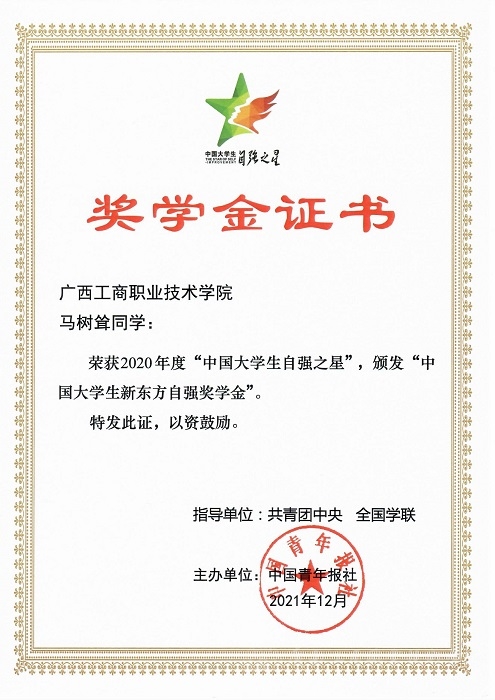 近日,由共青團(tuán)中央、全國(guó)學(xué)聯(lián)指導(dǎo),中國(guó)青年報(bào)社、新東方教育科技集團(tuán)聯(lián)合開(kāi)展的2020年度“中國(guó)大學(xué)生自強(qiáng)之星”獎(jiǎng)學(xué)金評(píng)選活動(dòng)結(jié)果揭曉。我院管理學(xué)院物流管理專(zhuān)業(yè)物流1803班何夢(mèng)婷、工商企業(yè)管理專(zhuān)業(yè)工商1903班馬樹(shù)聳兩位同學(xué)榮獲2020年度“中國(guó)大學(xué)生自強(qiáng)之星”榮譽(yù)稱號(hào),并獲得“中國(guó)大學(xué)生新東方自強(qiáng)獎(jiǎng)學(xué)金”。
