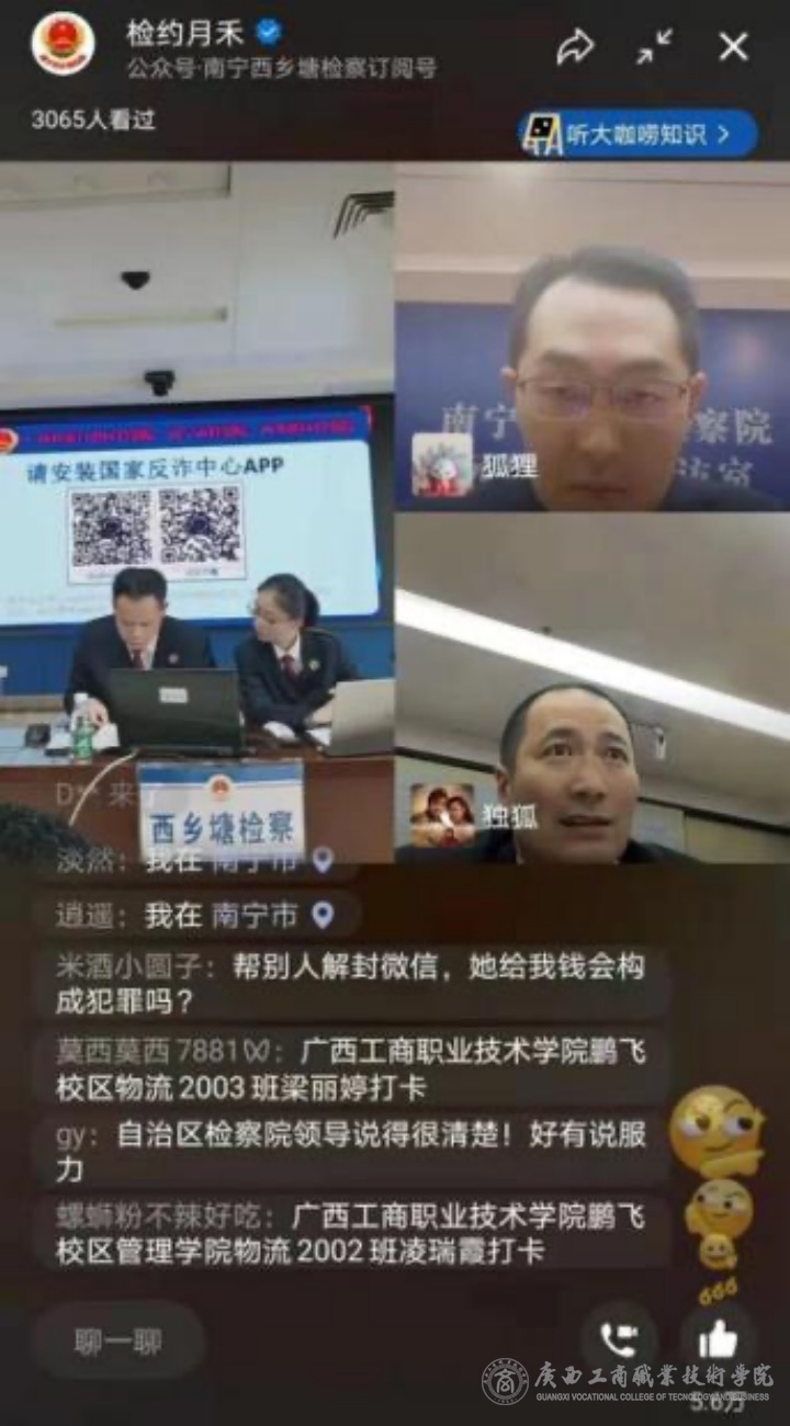 根據(jù)《自治區(qū)教育廳關(guān)于印發(fā)持續(xù)深入開展校園安全專項(xiàng)整頓工作方案的通知》(桂教安穩(wěn)〔2022〕6號(hào) )文件精神,為全面普及防范電信網(wǎng)絡(luò)詐騙、抵制校園貸知識(shí),提升學(xué)生法律意識(shí)、防騙意識(shí),教育學(xué)生理性消費(fèi),2022年3月25日(星期五)下午15:00—17:00,我院邀請廣西壯族自治區(qū)、南寧市、西鄉(xiāng)塘區(qū)三級(jí)檢察院開展了“防范電信網(wǎng)絡(luò)詐騙、抵制校園網(wǎng)絡(luò)貸款”線上主題宣講活動(dòng)。此次線上宣講活動(dòng)通過“騰訊會(huì)議”、“檢約月禾”訂閱號(hào)直播兩種形式同步進(jìn)行。我校師生通過手機(jī)自主觀看、宿舍集體觀看、教室統(tǒng)一觀看等多種形式參與其中。