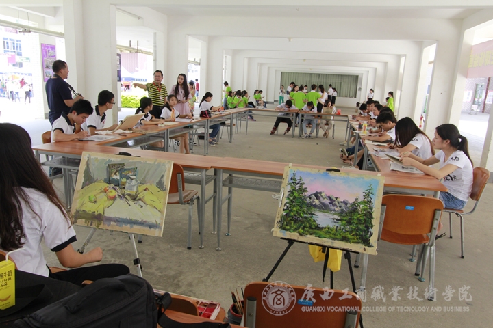 不遠(yuǎn)處,宿舍樓架空層的技能展示正在進(jìn)行?!柏?cái)信系畢業(yè)生學(xué)生作品展”則現(xiàn)場(chǎng)展示了廣告設(shè)計(jì)與制作專業(yè)同學(xué)嫻熟而獨(dú)具創(chuàng)意的設(shè)計(jì)和室內(nèi)設(shè)計(jì)技術(shù)專業(yè)學(xué)生現(xiàn)場(chǎng)素描和水粉作畫的本領(lǐng)。