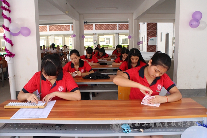同時(shí),會(huì)計(jì)系學(xué)生在學(xué)生公寓樓架空層展示點(diǎn)鈔、珠算的技能,嫻熟的珠算打法,撥動(dòng)的算珠敲擊著算盤框,聲聲連珠陣陣響,學(xué)生低頭認(rèn)真點(diǎn)鈔,速度手法技巧令人折服。