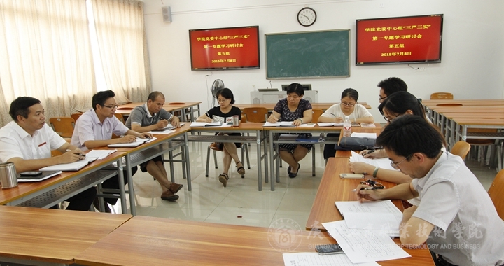 為了進一步加強學院黨員干部的思想道德建設,做好“三嚴三實”第一專題學習研討有關工作,我院中層以上領導干部在結(jié)束7月8日上午的“三嚴三實”第一專題集中學習研討后,于下午3點整,在教學樓分五組進行黨委理論學習中心組(擴大)學習會分組討論。