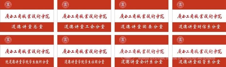 在道德講堂硬件布置上,我院突出 “以德育商”元素,體現(xiàn)商院特色,設(shè)計(jì)了專門(mén)的“道德講堂”統(tǒng)一LOGO標(biāo)識(shí)、講堂背景板、道德箴言掛板及紀(jì)念品。并為道德講堂總堂、工會(huì)分堂、團(tuán)委分堂、學(xué)院學(xué)生組織分堂、學(xué)院學(xué)生社團(tuán)分堂和各系分堂制作了專門(mén)的“廣商育人紅”道德講堂旗幟。