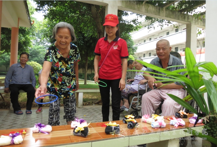 一走進(jìn)公寓全體志愿者以積極、熱情的態(tài)度向各位老人問(wèn)好,老人們看見(jiàn)同學(xué)們的到來(lái)紛紛鼓掌表示歡迎,隨后志愿者分別對(duì)老人主動(dòng)噓寒問(wèn)暖、與他們聊天、給老人適當(dāng)?shù)匕茨Α⒄J(rèn)真聆聽(tīng)老人講他們以前經(jīng)歷過(guò)的事情,接著跟老人們互動(dòng)為老人送上了歌曲《軍中綠花》《甜蜜蜜》、《我只在乎你》讓老人們喜笑顏開(kāi)。有的奶奶則即興唱起了膾炙人口的老歌??吹接腥吮硌莨?jié)目,老人們也激動(dòng)地拍手,其樂(lè)融融。隨后志愿者們就與老人們玩起了套圈圈的游戲。雖然老人們年紀(jì)大了,但是手腳還是很靈活的,老人們都很積極的參加游戲。不一會(huì)兒,手上都拿滿了小禮物,老人們都很開(kāi)心,笑得嘴都合不攏了。在一片空地上,志愿者們還跟身體硬朗的王奶奶學(xué)起了打太極、跳廣場(chǎng)舞等。