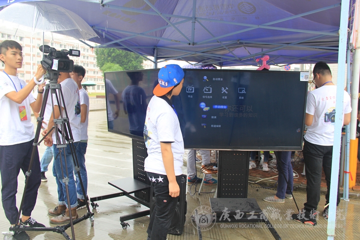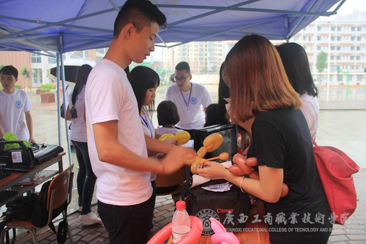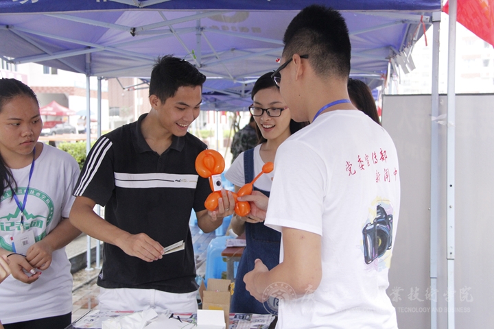 招新第一天,新聞中心無課同學(xué)全體出動(dòng),所有專業(yè)設(shè)備現(xiàn)場(chǎng)展示,安裝兩臺(tái)電視循環(huán)播放招新宣傳片,現(xiàn)場(chǎng)還使用上了廣場(chǎng)音響。在報(bào)名現(xiàn)場(chǎng),新聞中心的同學(xué)們還別出心裁地吹起氣球,并扎成各種新奇造型,貼上學(xué)院官方微信二維碼后送給報(bào)名的新同學(xué)。