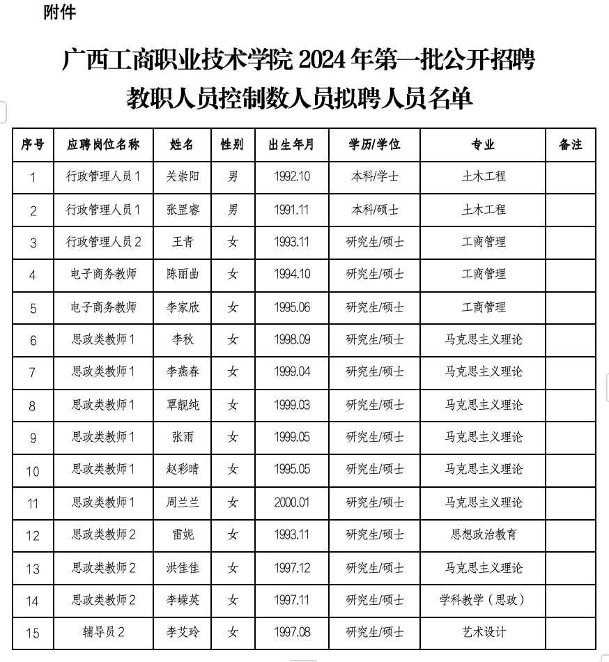 附件:廣西工商職業(yè)技術(shù)學(xué)院2024年第一批公開(kāi)招聘教職人員控制數(shù)人員擬聘人員名單
