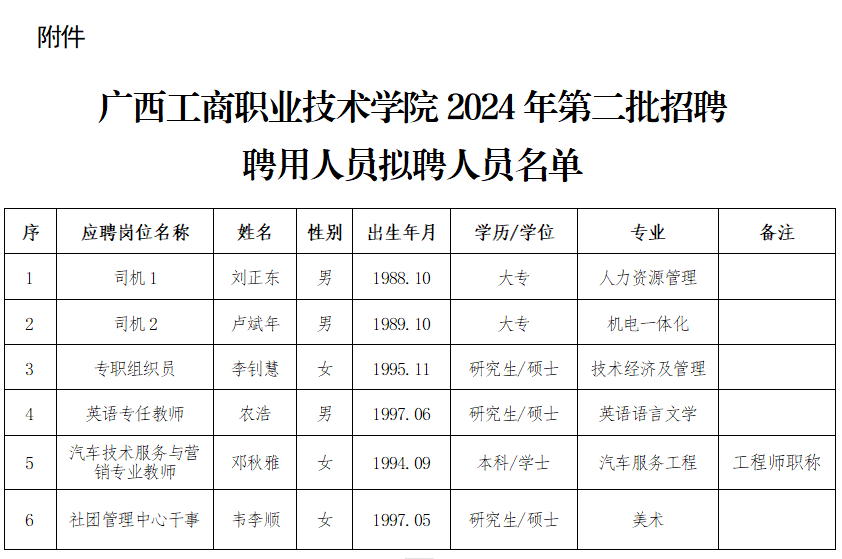 附件:廣西工商職業(yè)技術(shù)學(xué)院2024年第二批招聘聘用人員擬聘人員名單