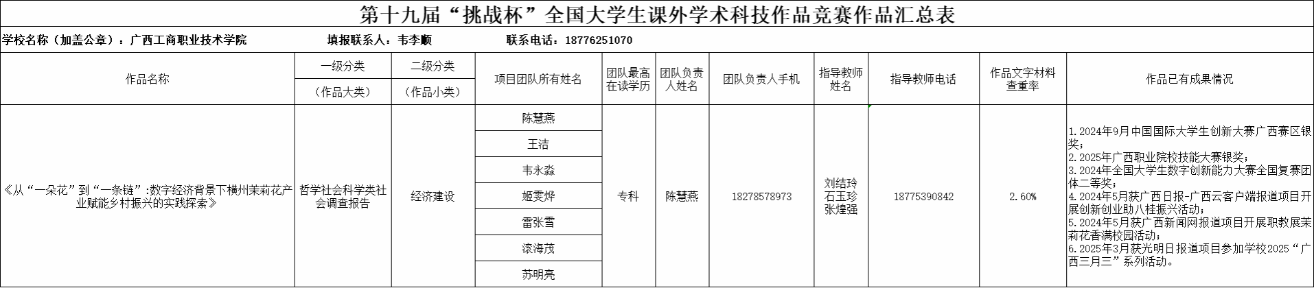 根據(jù)《關(guān)于組織開(kāi)展第十九屆“挑戰(zhàn)杯”全國(guó)大學(xué)生課外學(xué)術(shù)科技作品競(jìng)賽的通知》精神,經(jīng)學(xué)生自主報(bào)名提交作品,共青團(tuán)廣西區(qū)委組織現(xiàn)場(chǎng)賽專(zhuān)家評(píng)審,擬推薦《從“一朵花”到“一條鏈”:數(shù)字經(jīng)濟(jì)背景下橫州茉莉花產(chǎn)業(yè)賦能鄉(xiāng)村振興的實(shí)踐探索》至全國(guó)組委會(huì)參加評(píng)審,現(xiàn)將名單公示,詳見(jiàn)附件。