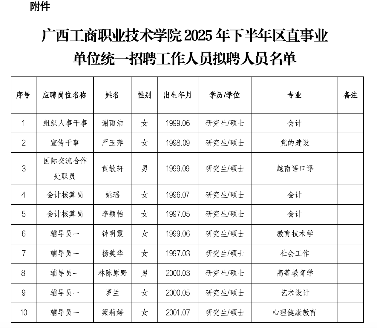 附件:廣西工商職業(yè)技術(shù)學(xué)院2025年下半年區(qū)直事業(yè)單位統(tǒng)一招聘工作人員擬聘人員名單