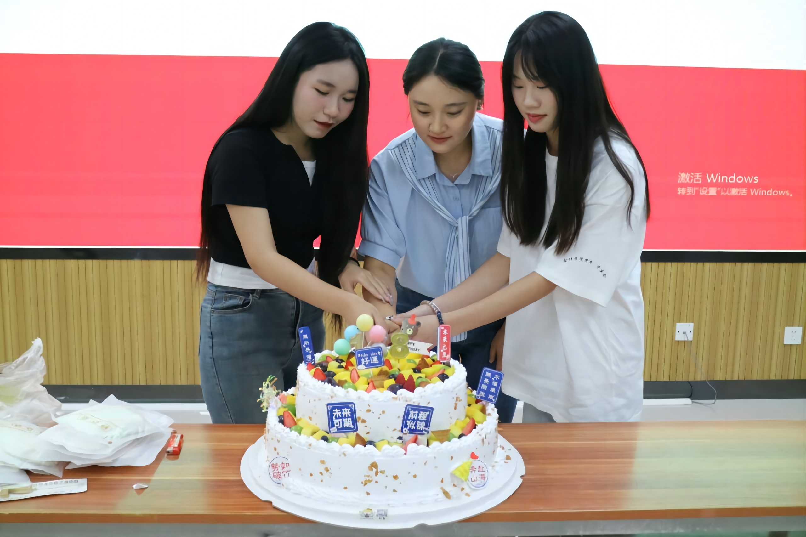 (圖為劉倩老師、22級執(zhí)行主席古蕓瑕和23級實(shí)習(xí)執(zhí)行主席李雪怡切蛋糕)