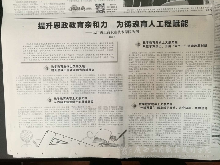 ? ? ??成風(fēng)化人,明德至善。廣西工商職業(yè)技術(shù)學(xué)院秉承“精工智商?明德修身”的校訓(xùn)精神,通過(guò)對(duì)思政教育工作的守正創(chuàng)新,以生動(dòng)活潑、學(xué)生喜聞樂(lè)見(jiàn)的形式,提升思政教育親和力,為鑄魂育人工程賦能,激勵(lì)著廣大師生勇做擔(dān)當(dāng)民族復(fù)興大任的時(shí)代新人。