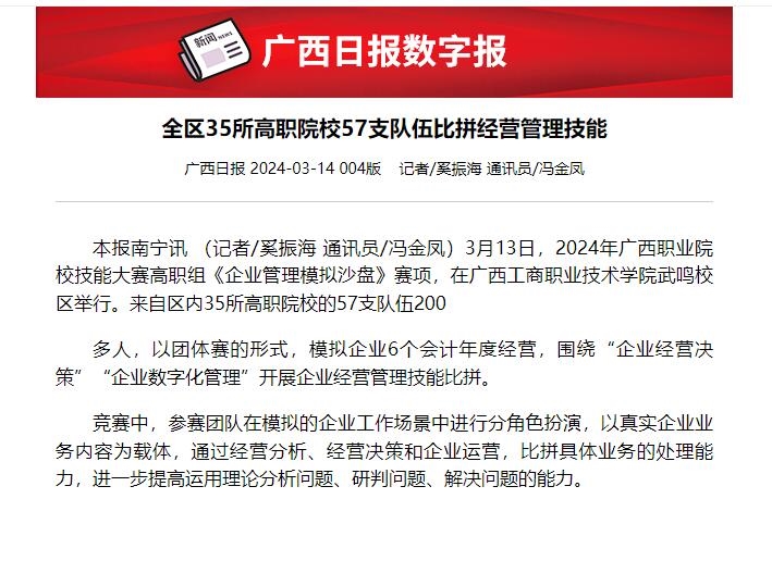 下一條: 【人民網(wǎng)】2024年廣西職業(yè)院校技能大賽高職組《企業(yè)管理模擬沙盤》賽項在廣西工商職業(yè)技術(shù)學(xué)院開賽