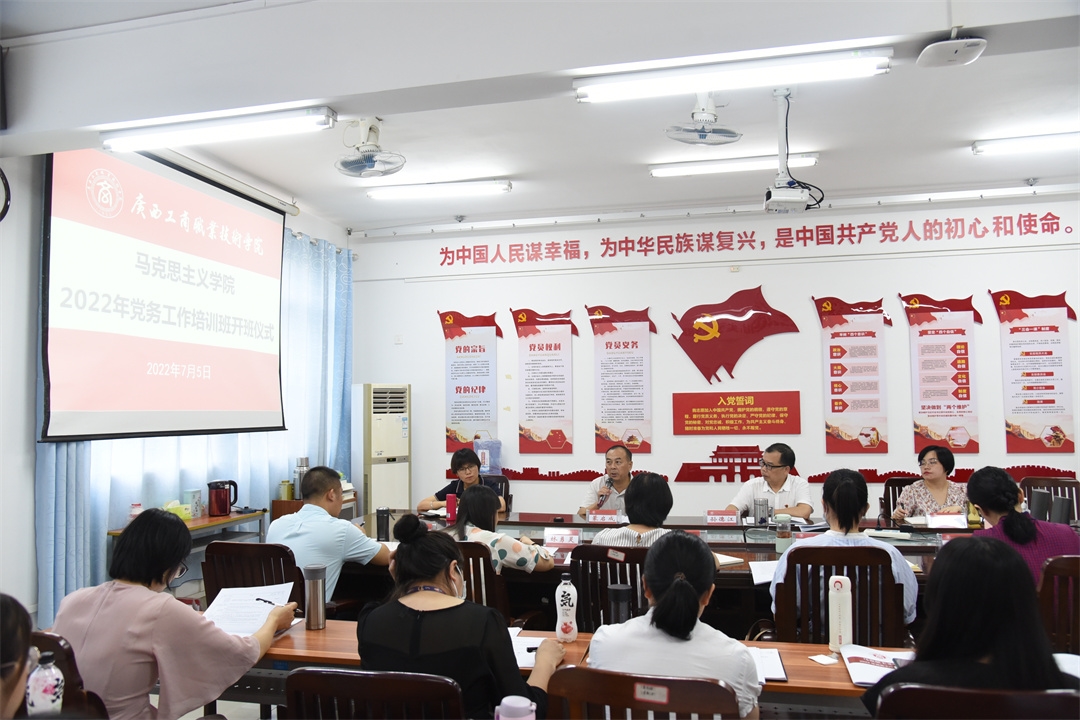 • 為切實提高我院馬克思主義學院黨務工作者的業(yè)務能力和理論素養(yǎng),推進馬克思主義學院黨建工作,7月5日,馬克思主義學院黨總支在我院鵬飛校區(qū)舉辦了2022年黨務工作培訓班。學院黨委副書記蒙啟成出席開班儀式并作動...