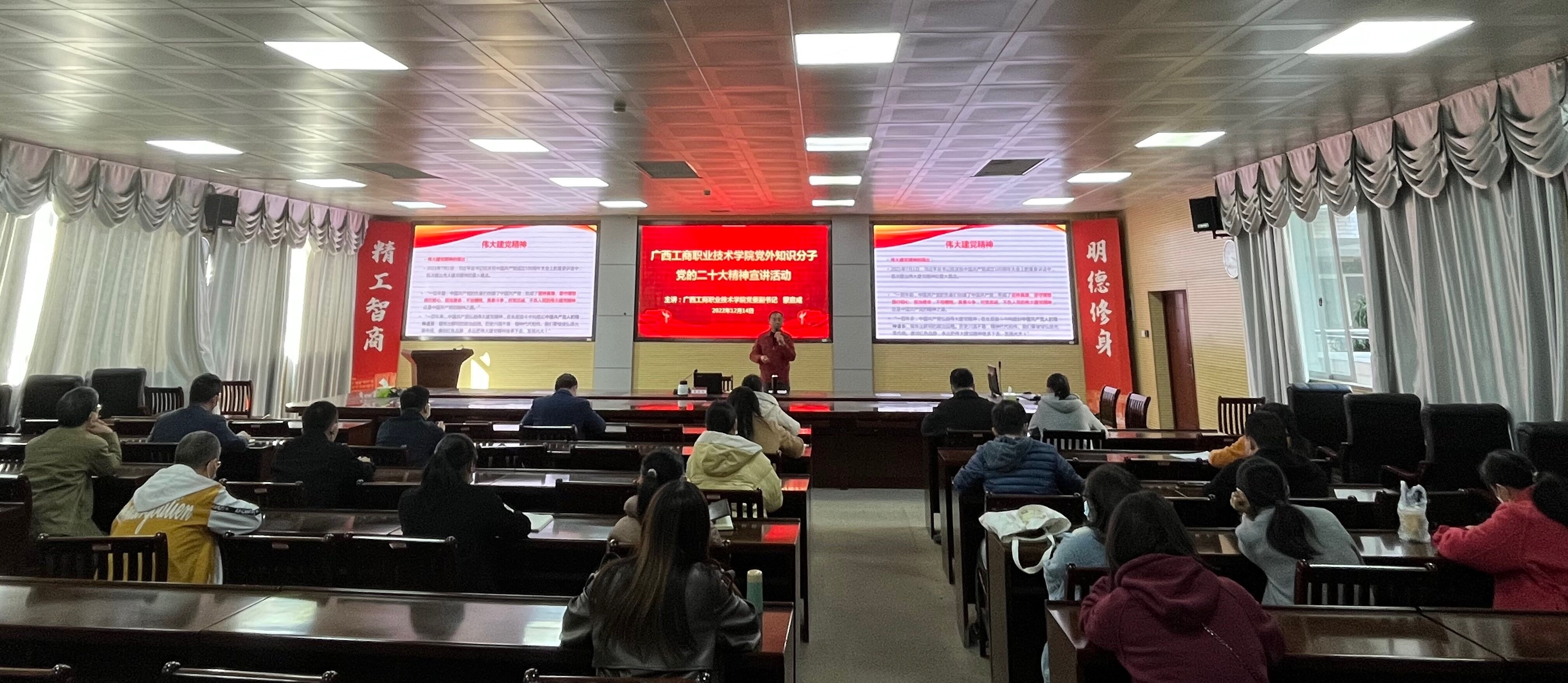 • (會議現(xiàn)場)(學院黨委副書記蒙啟成作主題宣講)2022年12月14日,我院舉辦專題宣講,面向學院黨外知識分子宣講黨的二十大精神。學院黨委副書記蒙啟成作主題宣講。學院各民主黨派成員、無黨派人士以及黨外知識分...