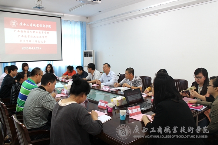 • 2016年4月21日下午,廣西國(guó)際商務(wù)職業(yè)技術(shù)學(xué)院學(xué)工處羅蘭芬處長(zhǎng)一行,廣西經(jīng)貿(mào)職業(yè)技術(shù)學(xué)院學(xué)工處潘文生處長(zhǎng)一行到我院就學(xué)生公寓管理、學(xué)生日常事務(wù)管理等方面的內(nèi)容與我院學(xué)工處進(jìn)行了工作交流。學(xué)院黨委蒙啟成...