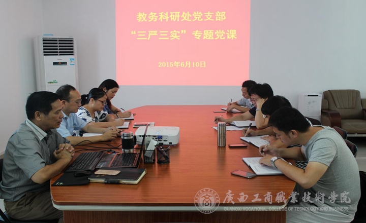 • 2015年6月10日上午10點,根據(jù)學院的安排,教務科研處黨支部開展了“三嚴三實”專題黨課活動。黨課由教務科研處韋勝強處長主持,教務科研處黨支部全體黨員參加,作為聯(lián)系領(lǐng)導,李維副院長也出席了教務科研處黨支部...